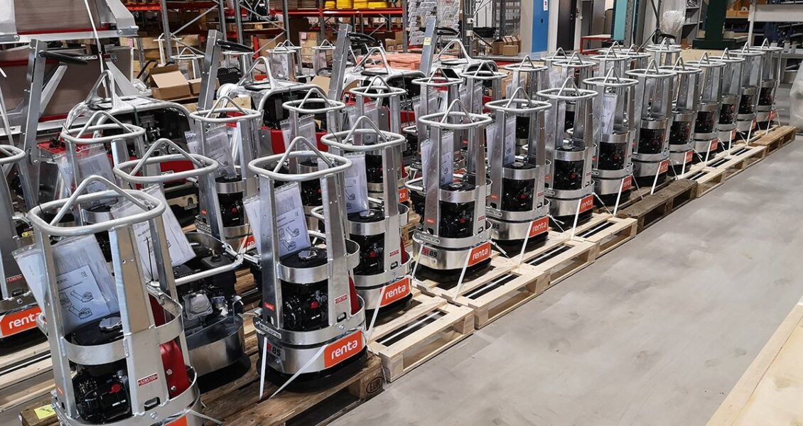Kärt barn har många namn; Rundpadda, Rörgravsvibrator, Rund markvibrator eller Tango. Här står det flera markvibratorer FR 85 från Swepac, helt nya i väntan på leverans till Rentas depåer.